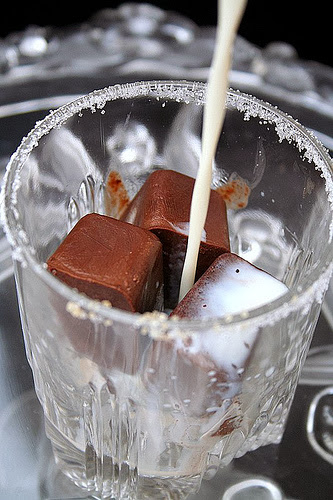 To serve, place the chocolate ice in glasses (depending on the size of the glasses 3-4 ice cubes) and pour over the milk cold vanilla.